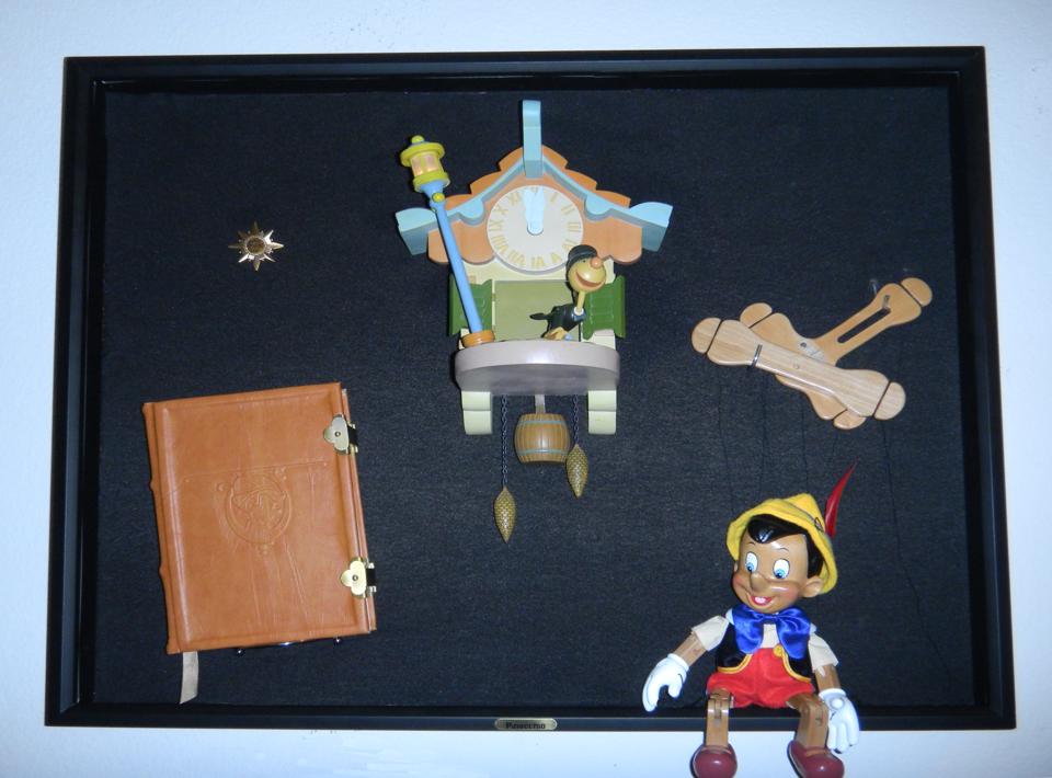 Pinocchio wood marionette, storybook, Jiminy conscience pin, and clock